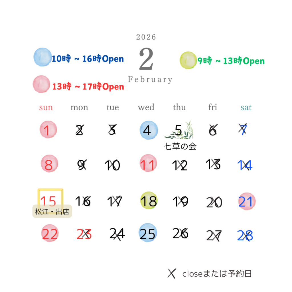 2月の予定 2026 1/21 その他 ハルジオン 加茂町 古民家 古民家雑貨 島根県 雑貨 雲南市 Tomoko Endo ハルジオン店主 2021年から、雲南市加茂町の古民家で、家族四人と、保護犬一匹と暮らしています。 プロフィールはこちら その他 ハルジオン 加茂町 古民家 古民家雑貨 島根県 雑貨 雲南市 この記事が気に入ったら フォローしてね! Follow Me 1月の予定 関連記事 1月の予定 神戸旅行 5月5日(日)「5月の庭カフェぐりんぐりん」 hanabira-week無事終わりました 桜の季節 2月2日はハルジオン2周年! 山陰中央新報に、お店の紹介記事が掲載されました だんだん広場 クリスマスマルシェ2023に出店します コメント コメントする コメントをキャンセルコメント ※ 名前 ※ メール ※ サイト 次回のコメントで使用するためブラウザーに自分の名前、メールアドレス、サイトを保存する。